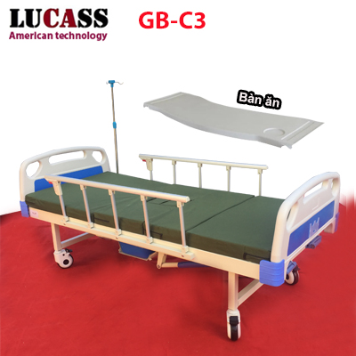 Trọn bộ giường y tế Lucass GB-C3 bao gồm: giường, đệm, lan can, cọc truyền dịch, bô vệ sinh, 2 tay quay, 1 cần gạt bô, bánh xe và bàn ăn.