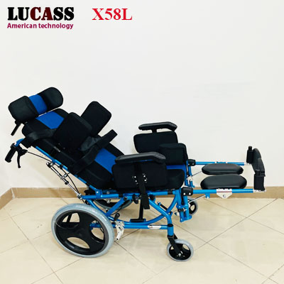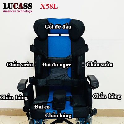 Xe lăn Lucass X58L dùng cho trẻ em bại não, người lớn nhỏ nhắn, người ngồi không vững, người không kiểm soát được hành vi.